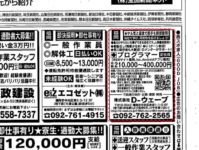 という事で スポーツ新聞 に求人を出してみました。今日(1/4)から3日間、西日本スポーツに掲載されます!